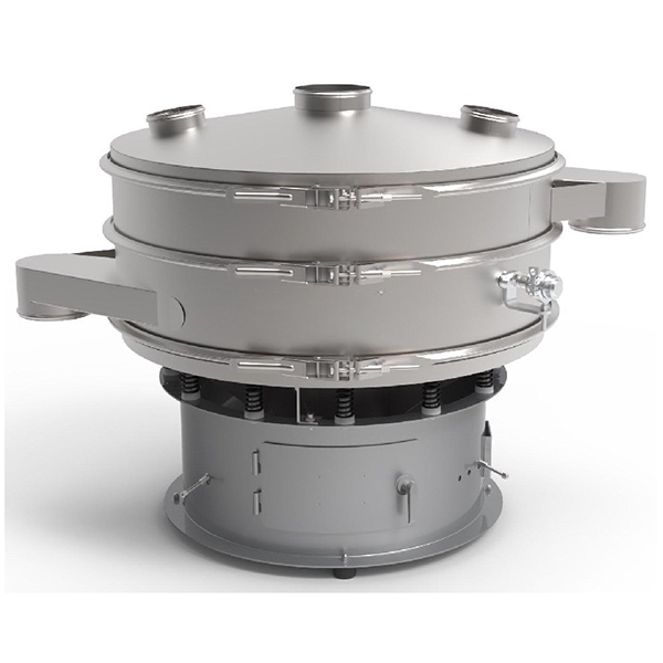 Impulsionados por um motor de vibração vertical, pesos excêntricos produzem vibrações horizontais, verticais e inclinadas, fazendo com que o corpo da peneira se mova em três dimensões. Isso gera uma trajetória espiralada para o material, rolando e distribuindo-o na malha para uma peneiração e classificação eficazes. Para pós microfinos, um sistema de vibração ultrassônica opcional sobrepõe microvibrações de alta frequência na malha, evitando entupimentos e aumentando a eficiência, especialmente para materiais pegajosos, ultrafinos ou aglomerados.